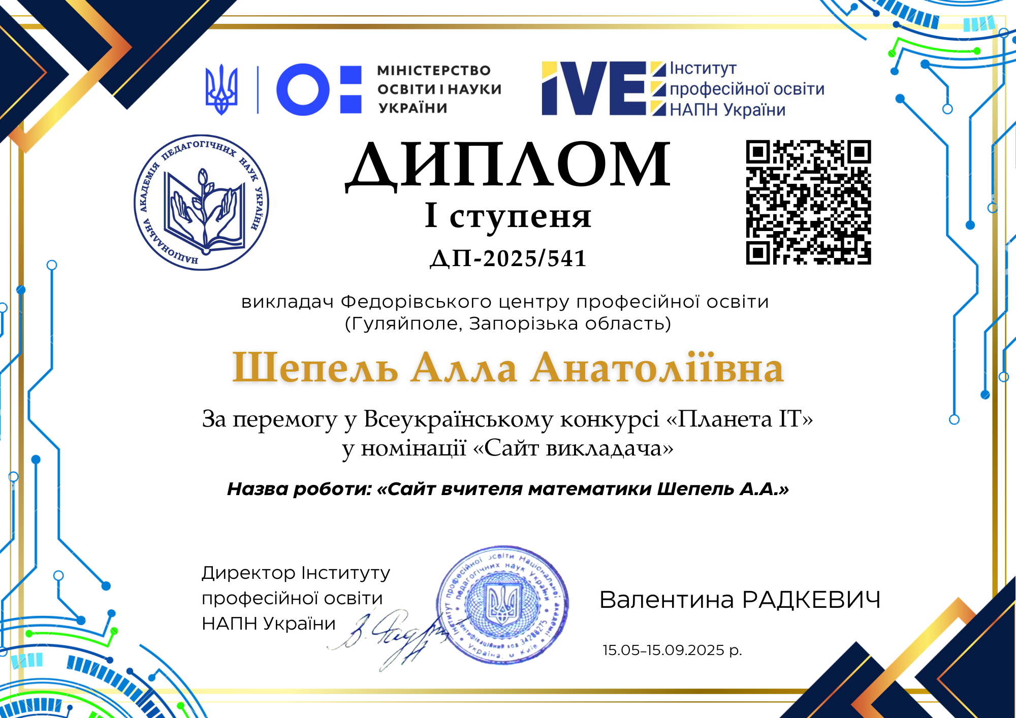 Рада поділитися чудовою новиною! Мій персональний сайт здобув Диплом І ступеня у Всеукраїнському конкурсі «Планета ІТ» 2025!
